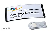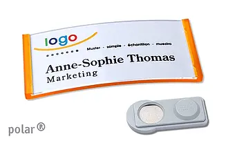 Das Designnamensschild polar® classic mit seiner integrierten Befestigung und leichter Wölbung passt sich harmonisch der Kleidung an. Da die Acrylglasscheibe seitlich fixiert ist, ergibt sich eine nach oben und unten angenehm offene Anmutung.