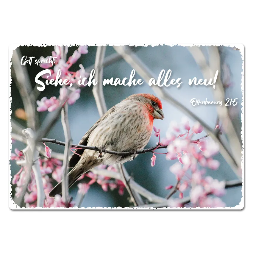 Das Blechschild wird mit dem Foto "Vögelchen im Frühling" und mit der Jahreslosung 2026 gedruckt. Optional stehen mehrere Befestigungsvarianten zur Verfügung.