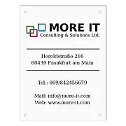 Das Schild wird aus hochwertigem transparenten Acrylglas gefertigt und mit Ihrem Wunschtext, Ihrer Grafik und/oder Ihrem Logo bedruckt.