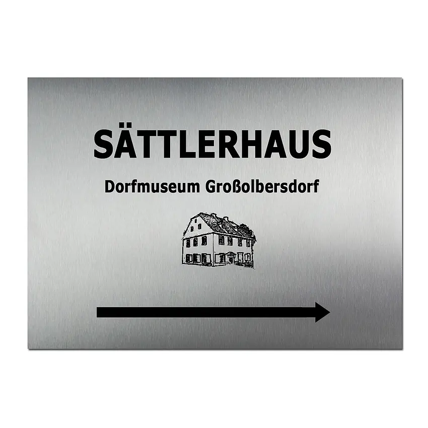 Die Oberflächengravur für dieses Schild entsteht mittels einer speziellen Lasertechnik, bei der die schwarze Farbe fest in die Edelstahlplatte eingebrannt wird. Das Schild erhält keine herausgefrästen Vertiefungen, wie es bei anderen Gravurverfahren sonst üblich ist.