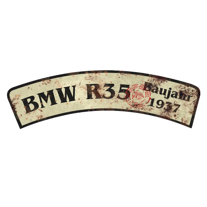 Sie erhalten eine Nachbildung eines zweiseitigen Motorrad-Nummernschildes. Es handelt sich um die gebogene Form, die gewöhnlich auf dem vorderen Schutzblech befestigt wurde. Im Volksmund wird dieses Nummernschild auch "Schädelspalter" genannt. Die Motorradnummernschilder in dieser gebogenen Form lösten die länglichen Nummernschilder ab 1928 ab und wurden im Deutschen Reich bis 1945 in der Form und Farbe verwendet. Nach dem Krieg bis 1948 gab es ebenfalls Schilder vorne auf dem Kotflügel, dann allerdings in unterschiedlichen Farben.