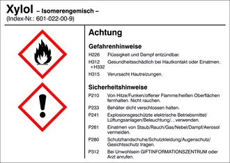 Die Schilder und Plaketten der Marke SafetyMarking dienen der vorschrifts- und normgerechten Kennzeichnung in Unternehmen, Behörden und öffentlichen Einrichtungen. Der Artikel Gefahrstoffetikett »G022: Xylol, Isomerengemisch« für Behälter mit einem Fassungsvermögen bis 3 Liter hat die Form Querformat mit den Dimensionen/Abmessungen BxH: 10,5x7,4 cm, Materialstärke: 0,1 mm und ist gefertigt aus dem Material PVC-Folie. Die Farbe ist weiss/rot-schwarz.
