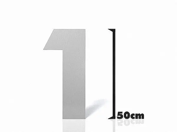 Große Zahlen sind auch von Weitem gut sichtbar. Deshalb empfehlen wir Edelstahlhausnummern in Übergröße besonders für Gebäude, die im Grundstück etwas entfernt von der Straße stehen. Die Höhe dieser Hausnummer beträgt 50 cm. Befestigungsmaterial, auch für wärmegedämmte Häuser, kann mitbestellt werden.