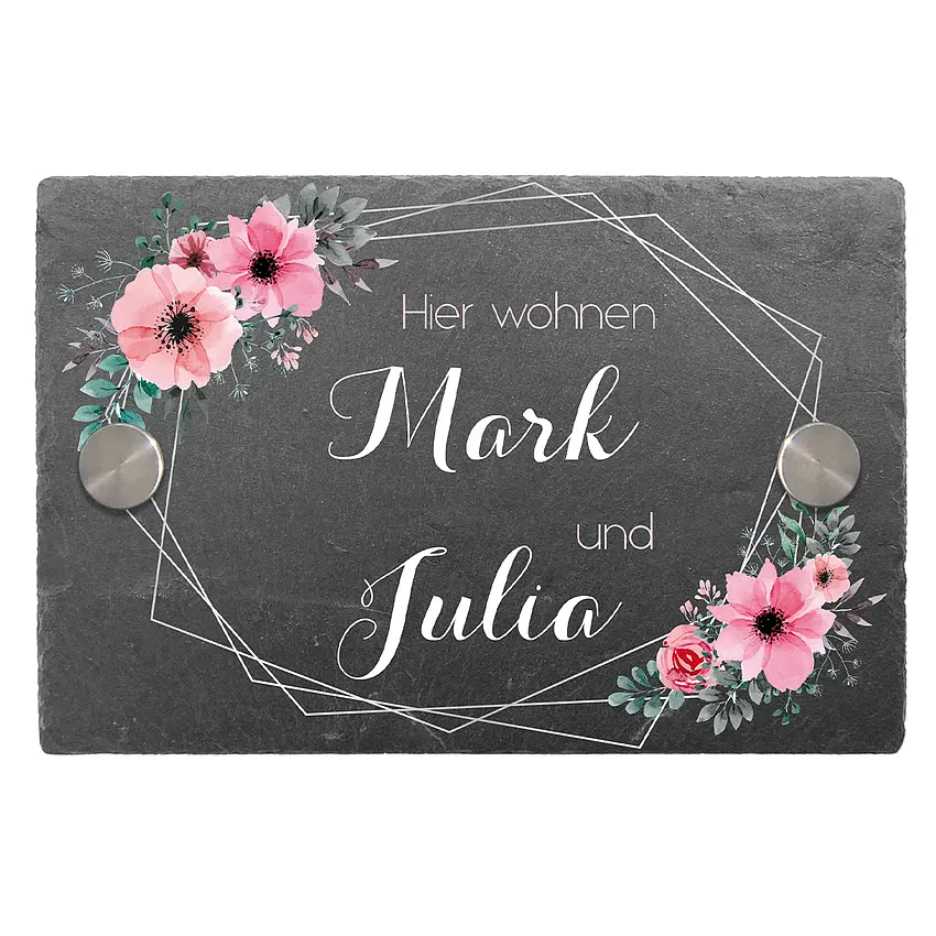 Das Schild aus Schiefer wurde im floralen Design gestaltet. Dazu passend wurde die Schrift kombiniert.