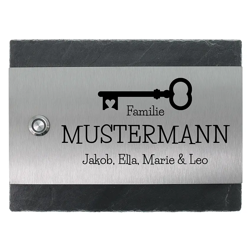 Das Klingelschild besteht aus eine Schieferplatte und einer Edelstahlplatte. Das Schild wird nach Ihren Wünschen beschriftet. Sie können aus vielen Schriften und Symbolen auswählen. Möchten Sie Einfluss auf die Gestaltung nehmen, dann empfehlen wir Ihnen die Option Vorabentwurf. Sie erhalten einen Gestaltungsvorschlag und können Wünsche äußern.