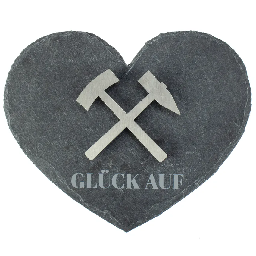 Das Schieferherz mit Schlägel und Eisen, sowie mit dem gravierten Schriftzug "Glück Auf" schlägt für alle Menschen, die mit dem Bergbau verbunden sind. Als Geschenkidee kommt das dekorative Schild bei Kumpels, Bergmännern, Geologen, Steiger, Historikern sehr gut an. Das Herz ist aus Naturschiefer gefertigt. Der Schriftzug wird graviert. Schlägel und Eisen sind aus hochwertigem Edelstahl mit gebürsteter Oberfläche gefertigt und wird auf das Schild montiert.