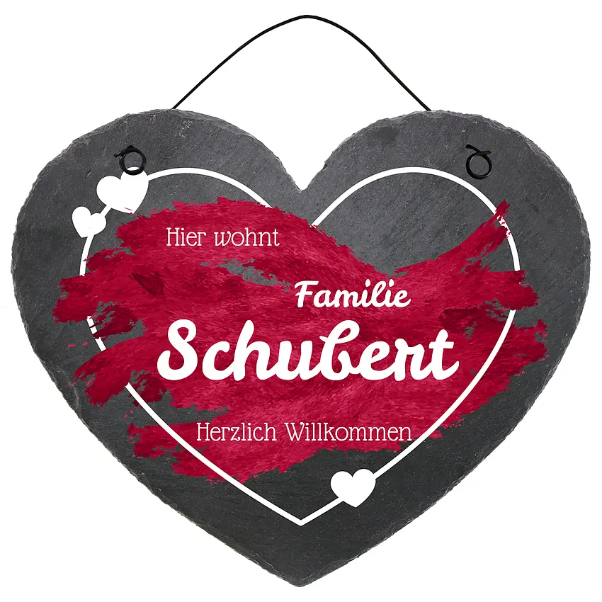 Das Schieferherz im jungen frischen Design wird mit Ihrem Namen personalisiert. Die Texte "Hier wohnt" sowie "Herzlich Willkommen" sind fest im Design vorgegeben. Möchten Sie jedoch diese Textpassagen anders gestalten, können Sie diese Wünsche im Anmerkungsfeld hinterlegen.