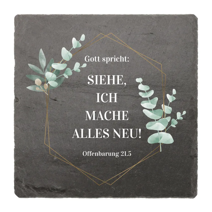 Die Schieferplatte wird mit dem Motiv Eukalyptus und der Jahreslosung 2026 gedruckt. In unsicheren Seiten suchen wir nach festen Zusagen. Eine wirklich feste Zusage kann ein Christ nur in der Bibel und im Ausblick auf die hoffnungsvolle Zukunft finden, die uns Gott verspricht. Siehe, er macht alles neu. Das Alte muss vergehen, ein neues Reich wird kommen - er wird uns retten aus der tiefsten Not - indem er alles neu macht.