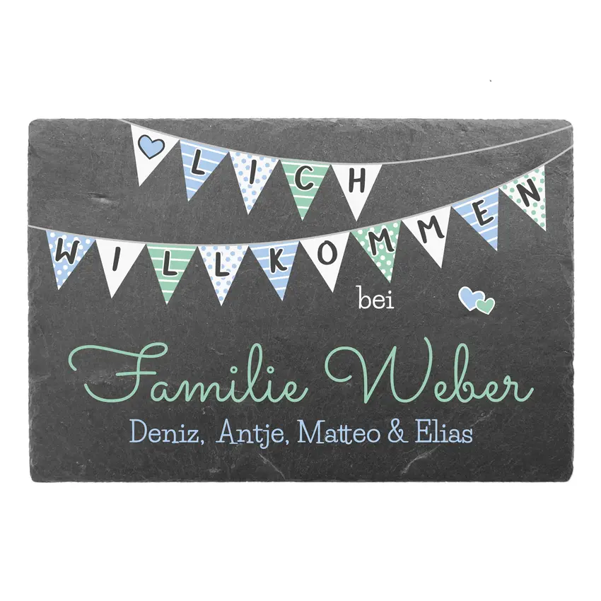 Das Schieferschild gestalten wir nach Ihren Wünschen. Die Wimpelkette mit der Aufschrift " Herzlich willkommen" ist fest im Design enthalten. Die Aufschrift mit dem Namen können Sie individuell vorgeben.